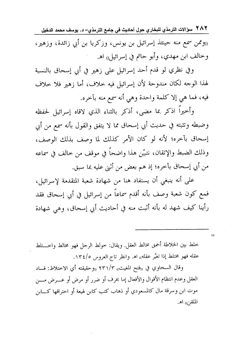 وأخيراً اذكر بما مضى، أذكر بالثناء الذي لاقاه إسرائيل لحفظه وضبطه وتثبته في حديث أبي إسحاق مما لا يتفق والقول بأنه سمع من أبي إسحاق بآخره؛ لأنه لو كان الأمر كذلك لما وصف بذلك الوصف، وذلك الضبط والإتقان، نتبيّن هذا واضحاً في موقف من خالف في سماعه من أبي إسحاق بآخره؛ إذ هم بعض من أثنى عليه بما سبق.
