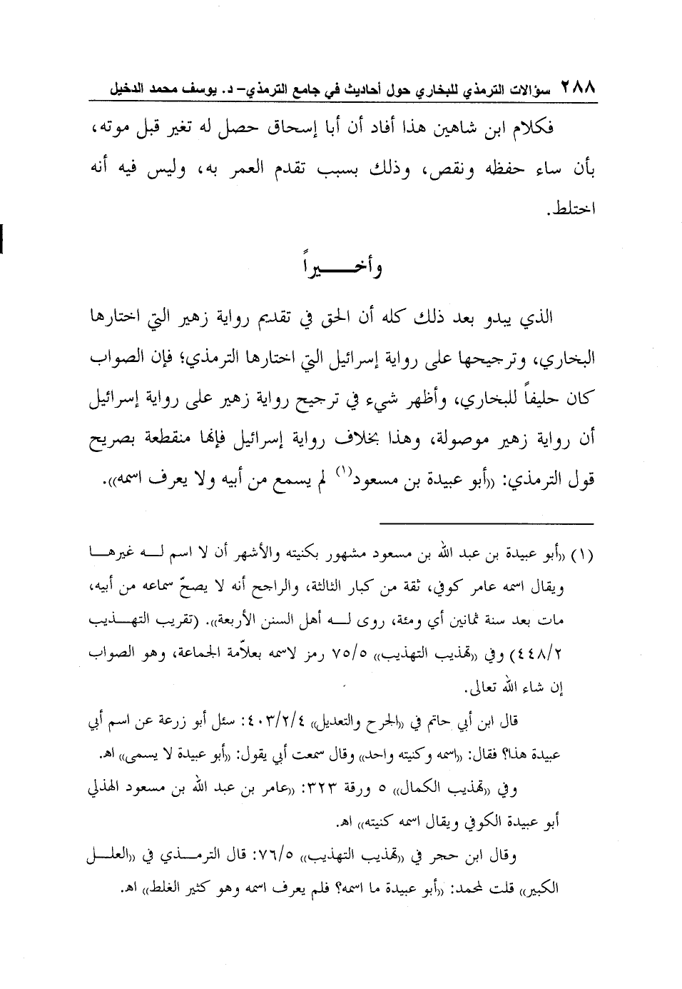 1 "أبو عبيدة بن عبد الله بن مسعود مشهور بكنيته والأشهر أن لا اسم له غيرها ويقال اسمه عامر كوفي، ثقة من كبار الثالثة، والراجح أنه لا يصحّ سماعه من أبيه، مات بعد سنة ثمانين أي ومئة، روى له أهل السنن الأربعة". (تقريب التهذيب 2/448) وفي "تهذيب التهذيب" 5/75 رمز لاسمه بعلاّمة الجماعة، وهو الصواب إن شاء الله تعالى.