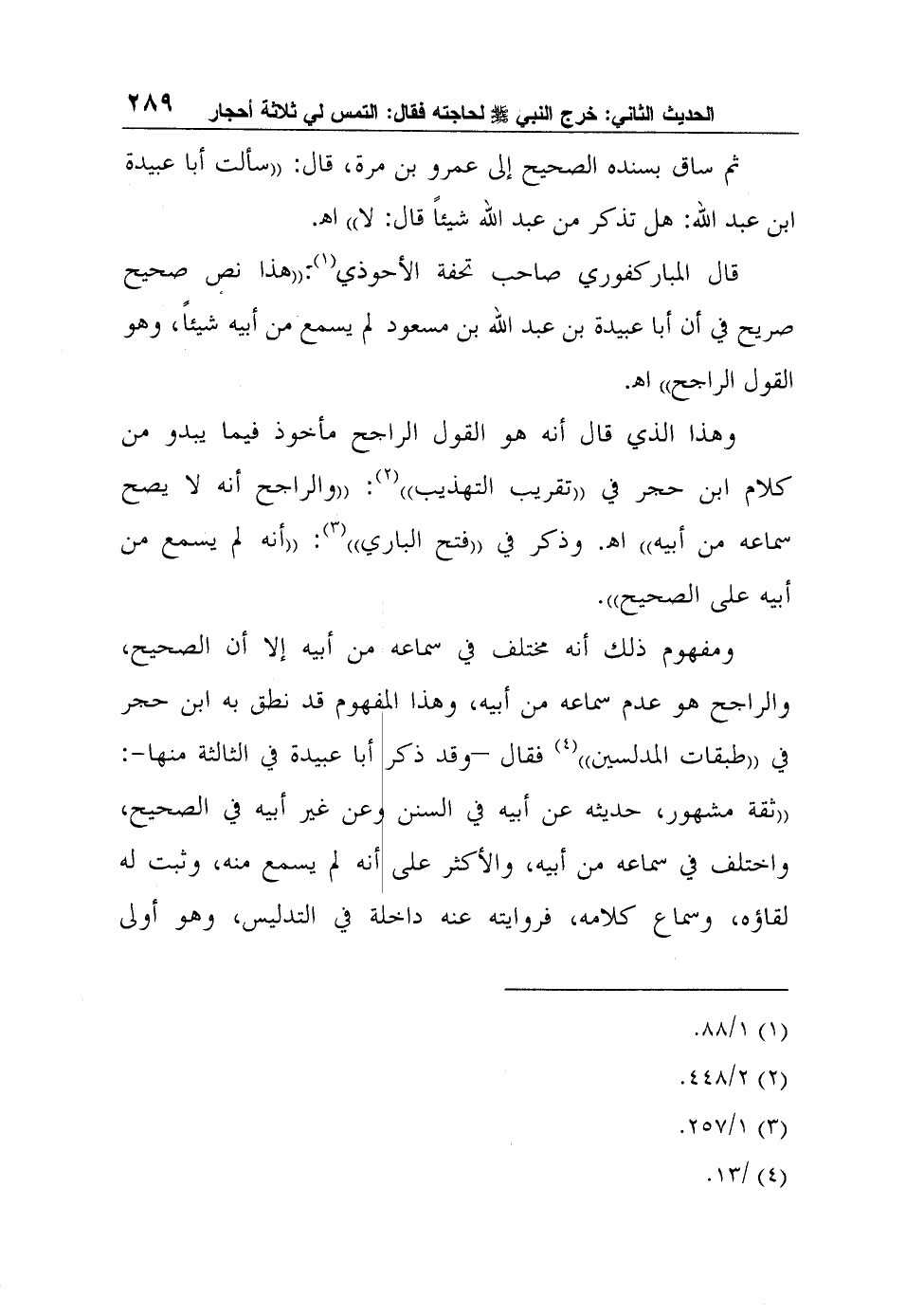 قال المباركفوري صاحب تحفة الأحوذي1:"هذا نص صحيح صريح في أن أبا عبيدة بن عبد الله بن مسعود لم يسمع من أبيه شيئاً، وهو القول الراجح" ا?.