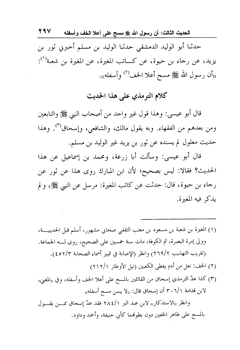 حدثنا أبو الوليد الدمشقي حدثنا الوليد بن مسلم أخبرني ثور بن يزيد، عن رجاء بن حيوة، عن كاتب المغيرة، عن المغيرة بن شعبة1: "أن رسول الله صلى الله عليه وسلم مسح أعلا الخف2 وأسفله".