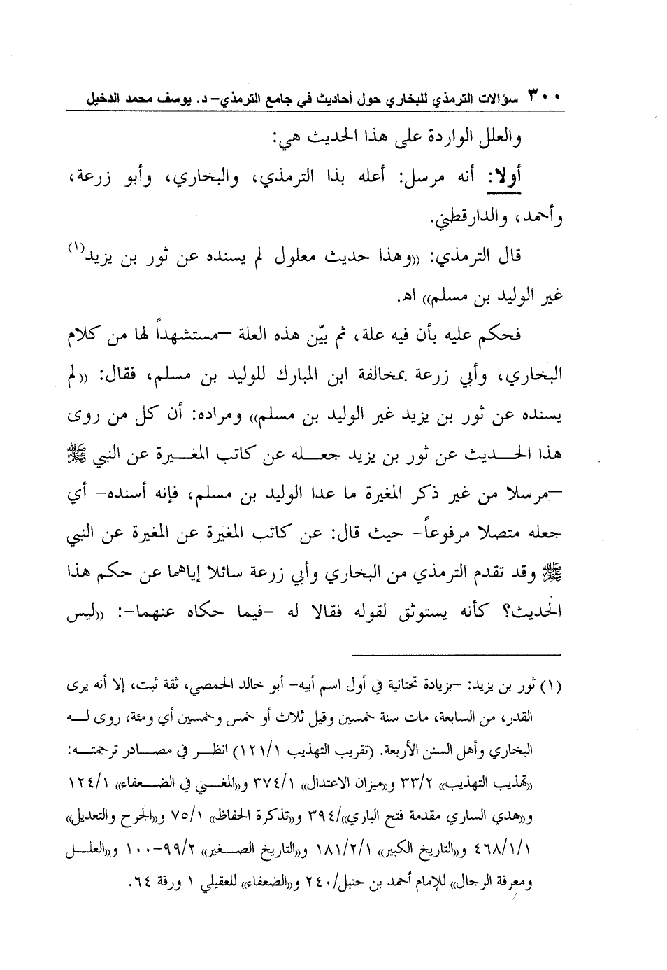 قال الترمذي: "وهذا حديث معلول لم يسنده عن ثور بن يزيد1 غير الوليد بن مسلم" ا?.