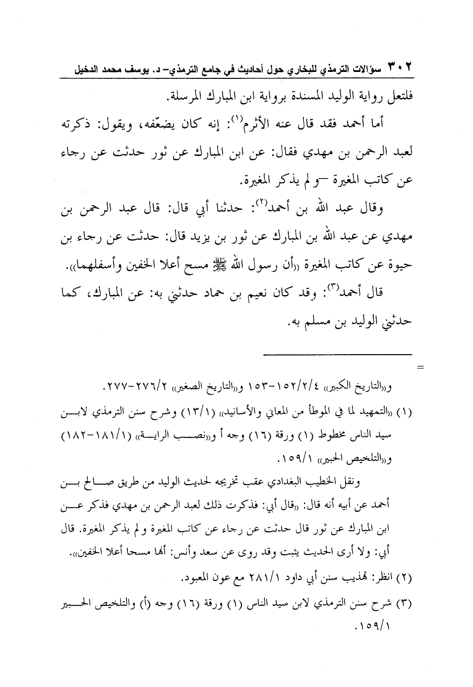 ونقل الخطيب البغدادي عقب تخريجه لحديث الوليد من طريق صالح بن أحمد عن أبيه أنه قال: "قال أبي: فذكرت ذلك لعبد الرحمن بن مهدي فذكر عن ابن المبارك عن ثور قال حدثت عن رجاء عن كاتب المغيرة ولم يذكر المغيرة. قال أبي: ولا أرى الحديث يثبت وقد روى عن سعد وأنس: أنها مسحا أعلا الخفين".
