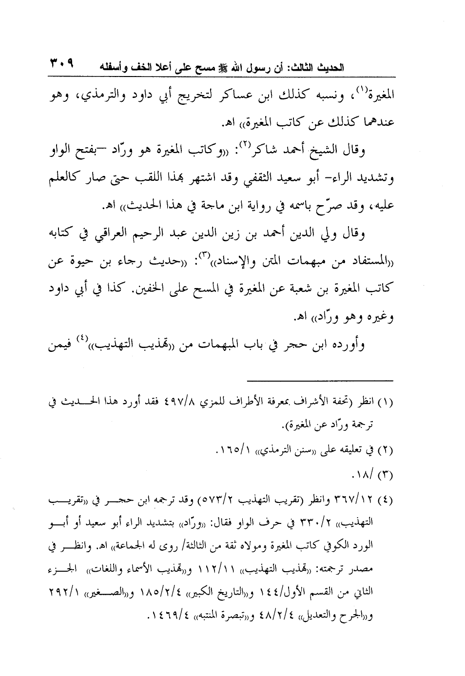 وقال ولي الدين أحمد بن زين الدين عبد الرحيم العراقي في كتابه "المستفاد من مبهمات المتن والإسناد"3: "حديث رجاء بن حيوة عن كاتب المغيرة بن شعبة عن المغيرة في المسح على الخفين. كذا في أبي داود وغيره وهو ورّاد" ا?.