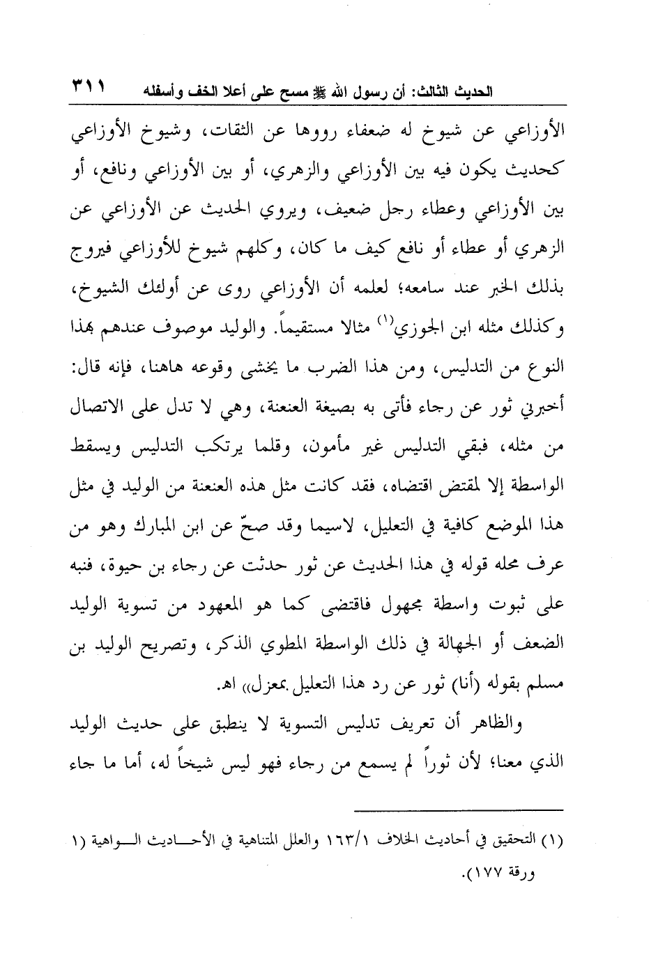 الأوزاعي عن شيوخ له ضعفاء رووها عن الثقات، وشيوخ الأوزاعي كحديث يكون فيه بين الأوزاعي والزهري، أو بين الأوزاعي ونافع، أو بين الأوزاعي وعطاء رجل ضعيف، ويروي الحديث عن الأوزاعي عن الزهري أو عطاء أو نافع كيف ما كان، وكلهم شيوخ للأوزاعي فيروج بذلك الخبر عند سامعه؛ لعلمه أن الأوزاعي روى عن أولئك الشيوخ، وكذلك مثله ابن الجوزي1 مثالا مستقيماً. والوليد موصوف عندهم بهذا النوع من التدليس، ومن هذا الضرب ما يخشى وقوعه هاهنا، فإنه قال: أخبرني ثور عن رجاء فأتى به بصيغة العنعنة، وهي لا تدل على الاتصال من مثله، فبقي التدليس غير مأمون، وقلما يرتكب التدليس ويسقط الواسطة إلا لمقتض اقتضاه، فقد كانت مثل هذه العنعنة من الوليد في مثل هذا الموضع كافية في التعليل، لاسيما وقد صحّ عن ابن المبارك وهو من عرف محله قوله في هذا الحديث عن ثور حدثت عن رجاء بن حيوة، فنبه على ثبوت واسطة مجهول فاقتضى كما هو المعهود من تسوية الوليد الضعف أو الجهالة في ذلك الواسطة المطوي الذكر، وتصريح الوليد بن مسلم بقوله (أنا) ثور عن رد هذا التعليل بمعزل" ا?.