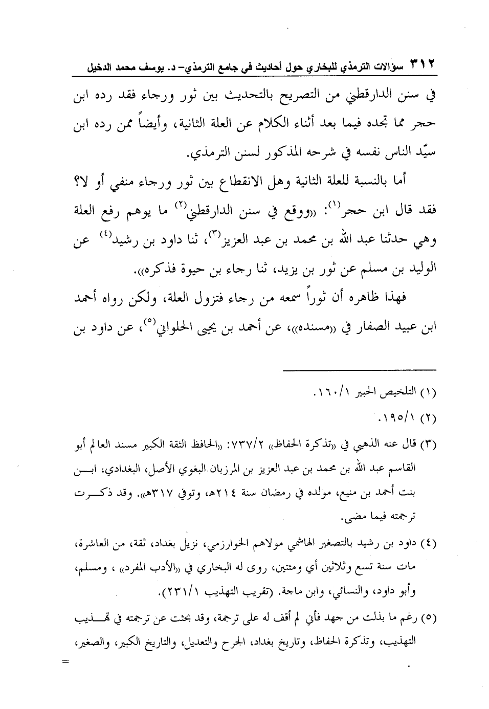في سنن الدارقطني من التصريح بالتحديث بين ثور ورجاء فقد رده ابن حجر مما تجده فيما بعد أثناء الكلام عن العلة الثانية، وأيضاً ممن رده ابن سيّد الناس نفسه في شرحه المذكور لسنن الترمذي.