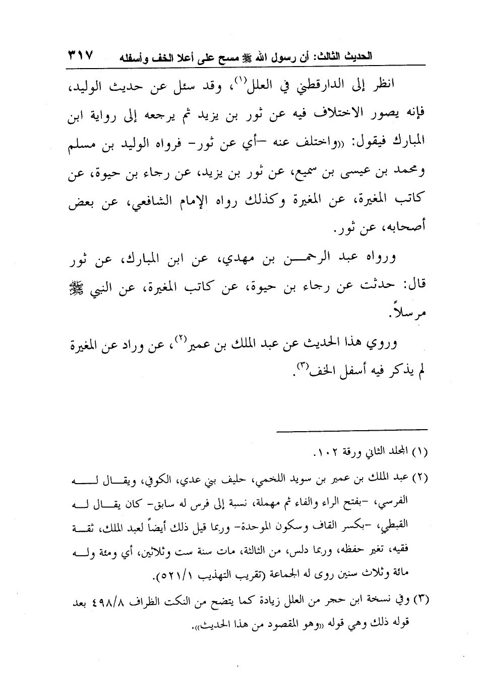 وروي هذا الحديث عن عبد الملك بن عمير2، عن وراد عن المغيرة لم يذكر فيه أسفل الخف3.