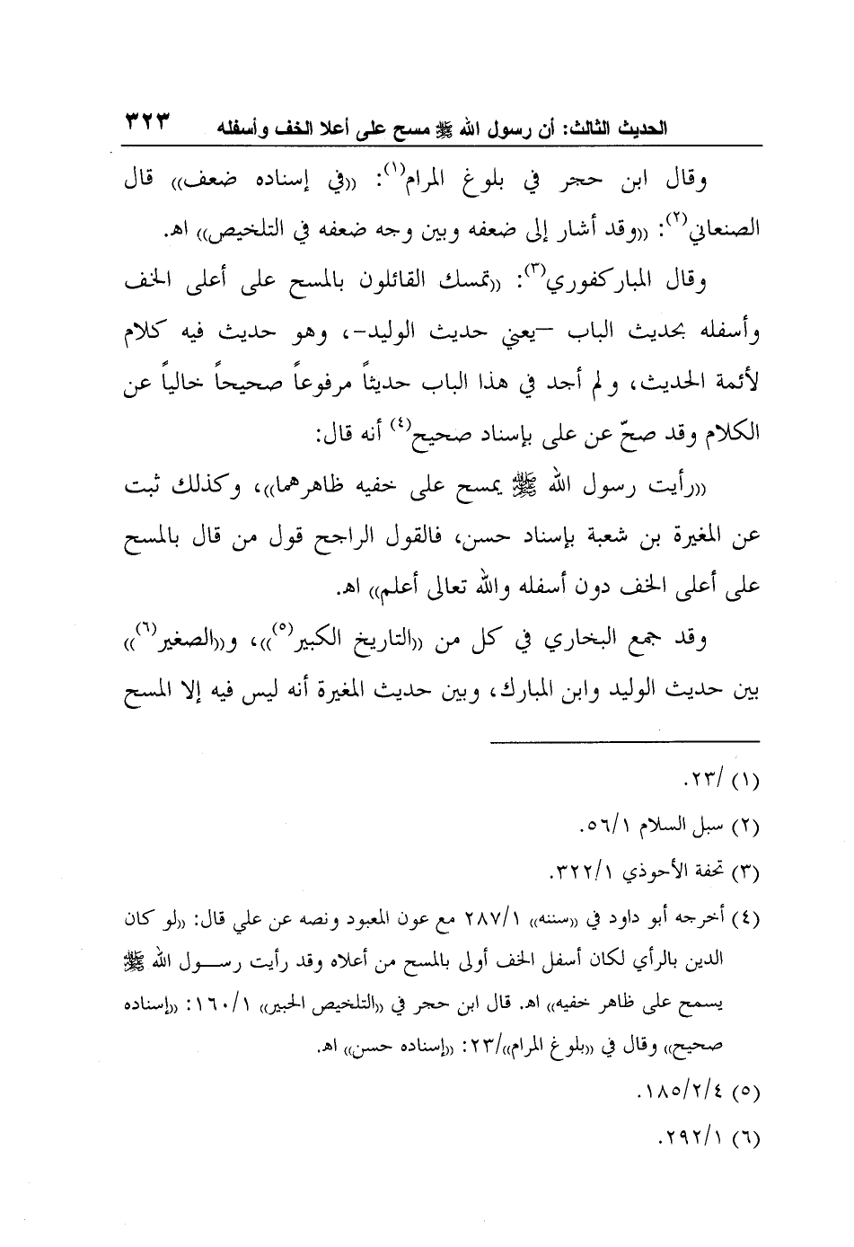 وقال المباركفوري3: "تمسك القائلون بالمسح على أعلى الخف وأسفله بحديث الباب –يعني حديث الوليد-، وهو حديث فيه كلام لأئمة الحديث، ولم أجد في هذا الباب حديثاً مرفوعاً صحيحاً خالياً عن الكلام وقد صحّ عن على بإسناد صحيح4 أنه قال: