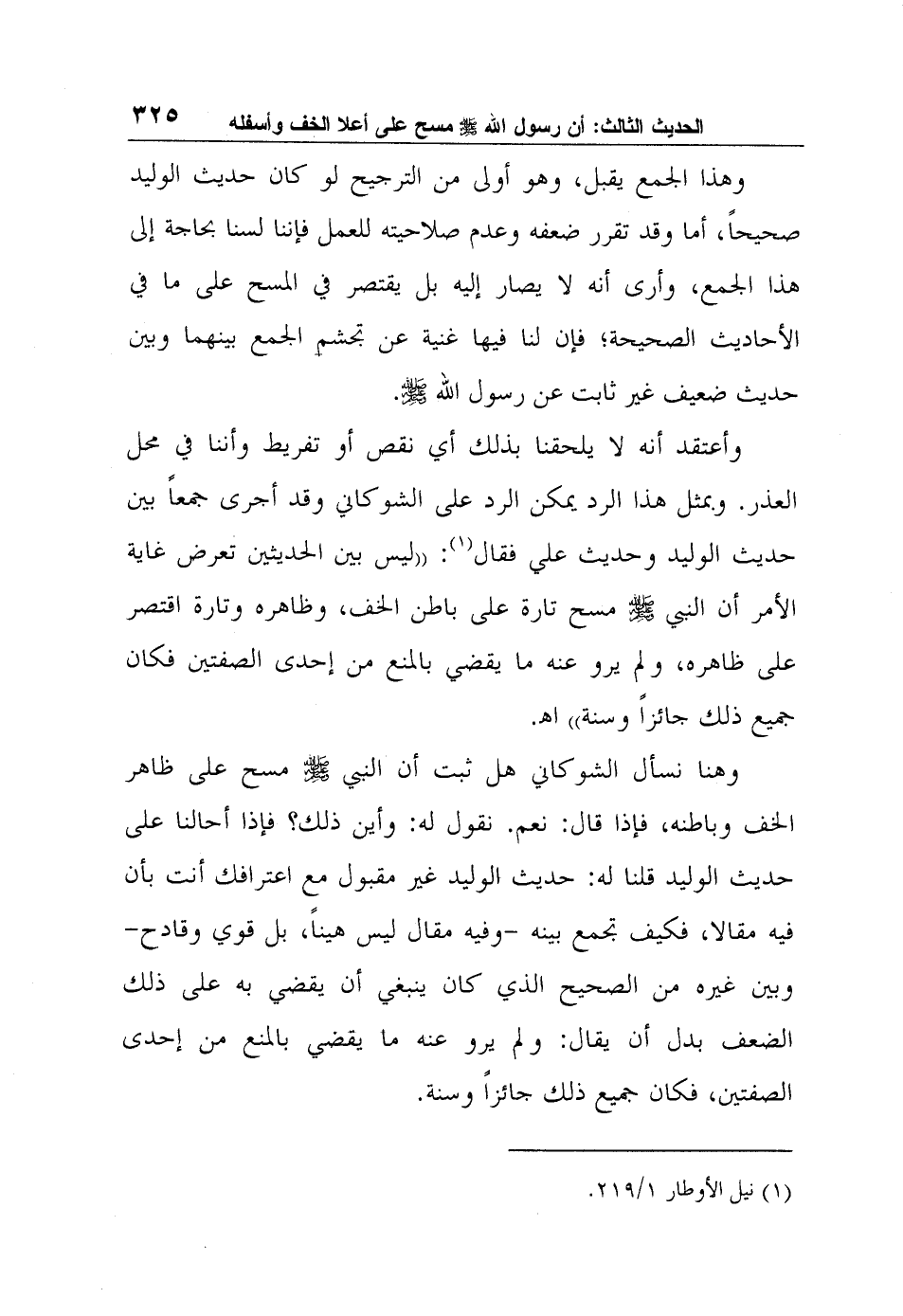 وأعتقد أنه لا يلحقنا بذلك أي نقص أو تفريط وأننا في محل العذر. وبمثل هذا الرد يمكن الرد على الشوكاني وقد أجرى جمعاً بين حديث الوليد وحديث علي فقال1: "ليس بين الحديثين تعرض غاية الأمر أن النبي صلى الله عليه وسلم مسح تارة على باطن الخف، وظاهره وتارة اقتصر على ظاهره، ولم يرو عنه ما يقضي بالمنع من إحدى الصفتين فكان جميع ذلك جائزاً وسنة" ا?.