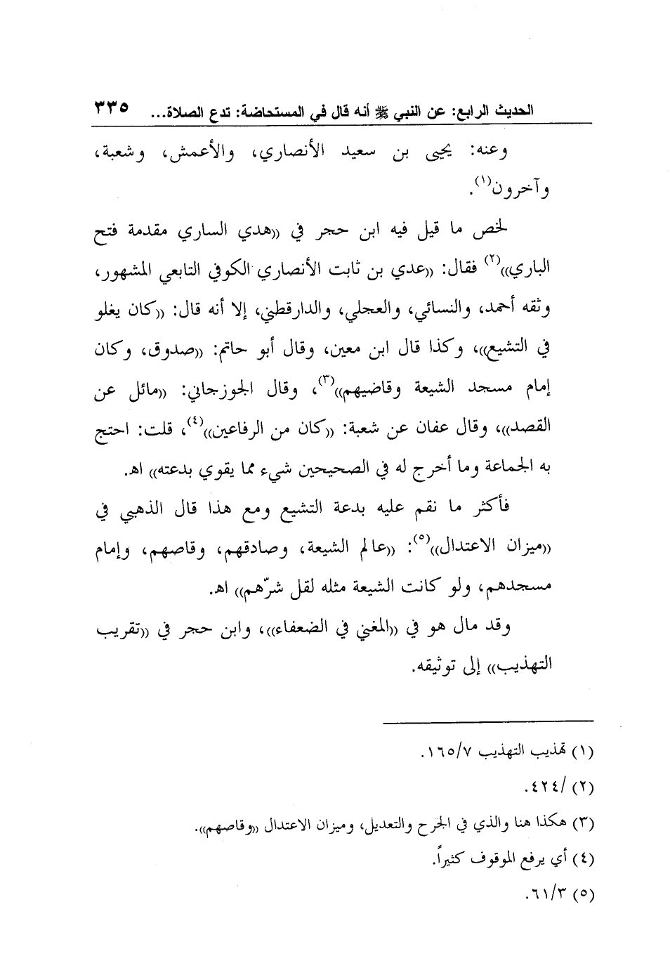 لخص ما قيل فيه ابن حجر في "هدي الساري مقدمة فتح الباري"2 فقال: "عدي بن ثابت الأنصاري الكوفي التابعي المشهور، وثقه أحمد، والنسائي، والعجلي، والدارقطني، إلا أنه قال: "كان يغلو في التشيع"، وكذا قال ابن معين، وقال أبو حاتم: "صدوق، وكان إمام مسجد الشيعة وقاضيهم"3، وقال الجوزجاني: "مائل عن القصد"، وقال عفان عن شعبة: "كان من الرفاعين"4، قلت: احتج به الجماعة وما أخرج له في الصحيحين شيء مما يقوي بدعته" ا?.