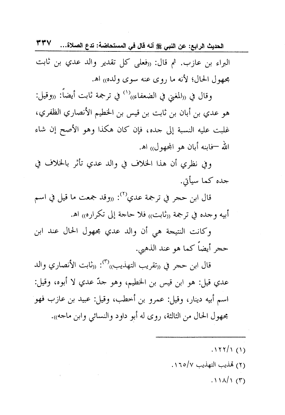 البراء بن عازب. ثم قال: "فعلى كل تقدير والد عدي بن ثابت مجهول الحال؛ لأنه ما روى عنه سوى ولده" ا?.