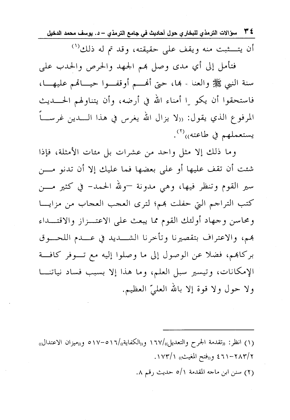 فتأمل إلى أي مدى وصل بهم الجهد والحرص والحدب على سنة النبي صلى الله عليه وسلم والعناية بها، حتى أنهم أوقفوا حياتهم عليها، فاستحقوا أن يكونوا أمناء الله في أرضه، وأن يتناولهم الحديث المرفوع الذي يقول: "لا يزال الله يغرس في هذا الدين غرساً يستعملهم في طاعته"2.