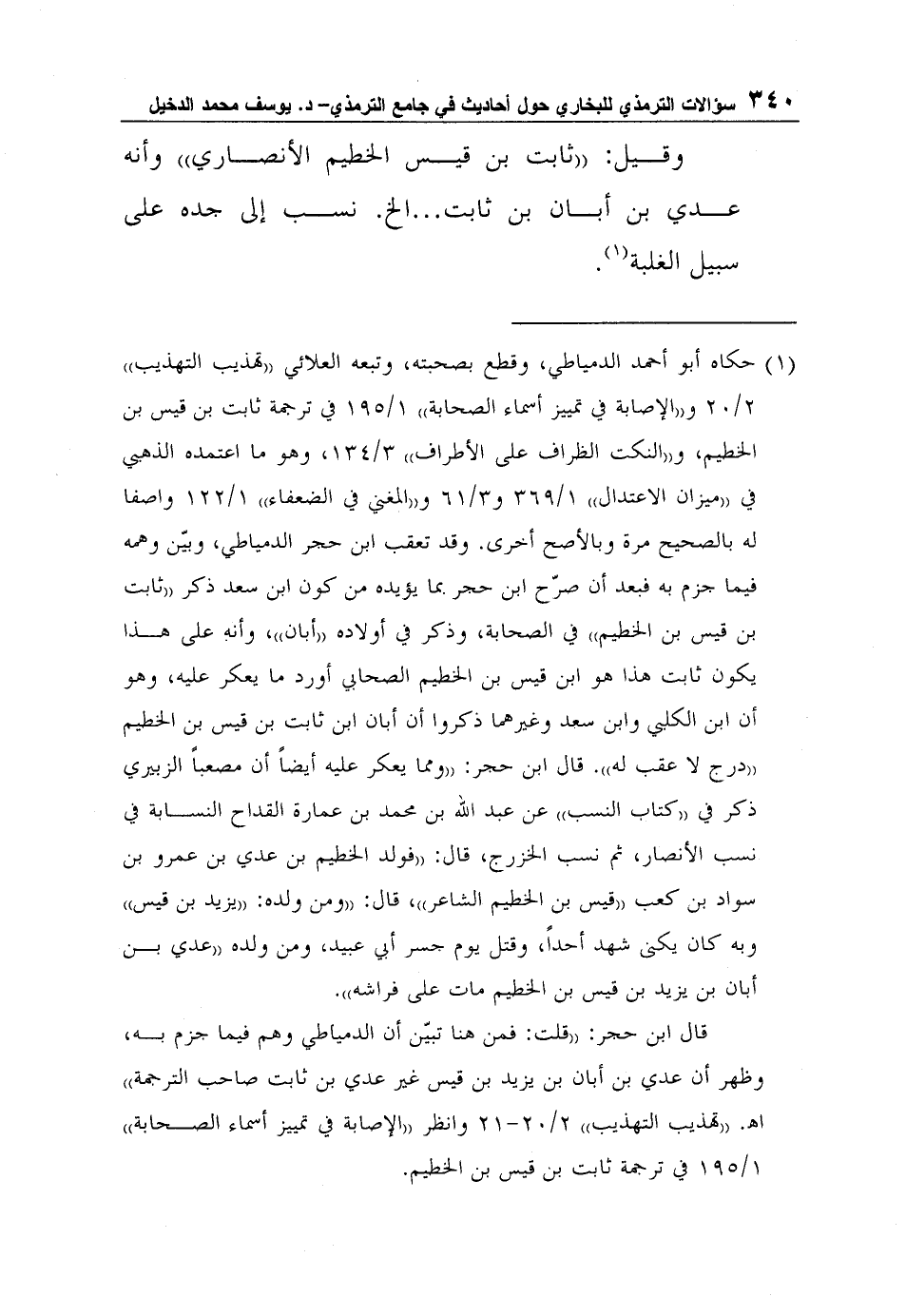 1 حكاه أبو أحمد الدمياطي، وقطع بصحبته، وتبعه العلائي "تهذيب التهذيب" 2/20 و"الإصابة في تمييز أسماء الصحابة" 1/195 في ترجمة ثابت بن قيس بن الخطيم، و"النكت الظراف على الأطراف" 3/134، وهو ما اعتمده الذهبي في "ميزان الاعتدال" 1/369 و3/61 و"المغني في الضعفاء" 1/122 واصفا له بالصحيح مرة وبالأصح أخرى. وقد تعقب ابن حجر الدمياطي، وبيّن وهمه فيما جزم به فبعد أن صرّح ابن حجر بما يؤيده من كون ابن سعد ذكر "ثابت بن قيس بن الخطيم" في الصحابة، وذكر في أولاده "أبان"، وأنه على هذا يكون ثابت هذا هو ابن قيس بن الخطيم الصحابي أورد ما يعكر عليه، وهو أن ابن الكلبي وابن سعد وغيرهما ذكروا أن أبان ابن ثابت بن قيس بن الخطيم "درج لا عقب له". قال ابن حجر: "ومما يعكر عليه أيضاً أن مصعباً الزبيري ذكر في "كتاب النسب" عن عبد الله بن محمد بن عمارة القداح النسابة في نسب الأنصار، ثم نسب الخزرج، قال: "فولد الخطيم بن عدي بن عمرو بن سواد بن كعب "قيس بن الخطيم الشاعر"، قال: "ومن ولده: "يزيد بن قيس" وبه كان يكنى شهد أحداً، وقتل يوم جسر أبي عبيد، ومن ولده "عدي بن أبان بن يزيد بن قيس بن الخطيم مات على فراشه".