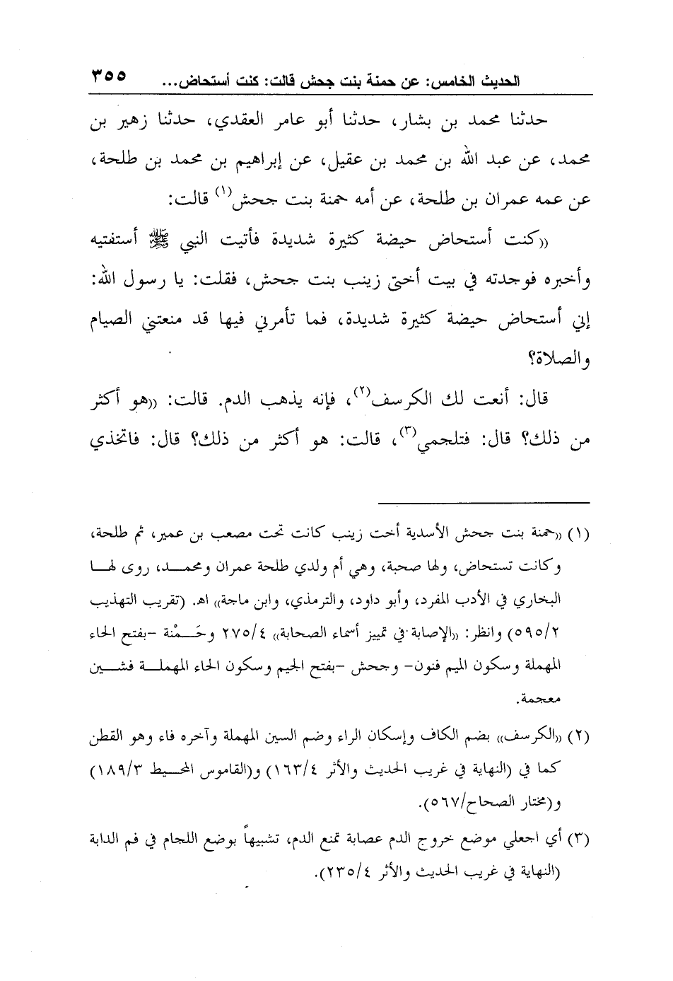 "كنت أستحاض حيضة كثيرة شديدة فأتيت النبي صلى الله عليه وسلم أستفتيه وأخبره فوجدته في بيت أختى زينب بنت جحش، فقلت: يا رسول الله: إني أستحاض حيضة كثيرة شديدة، فما تأمرني فيها قد منعتني الصيام والصلاة؟