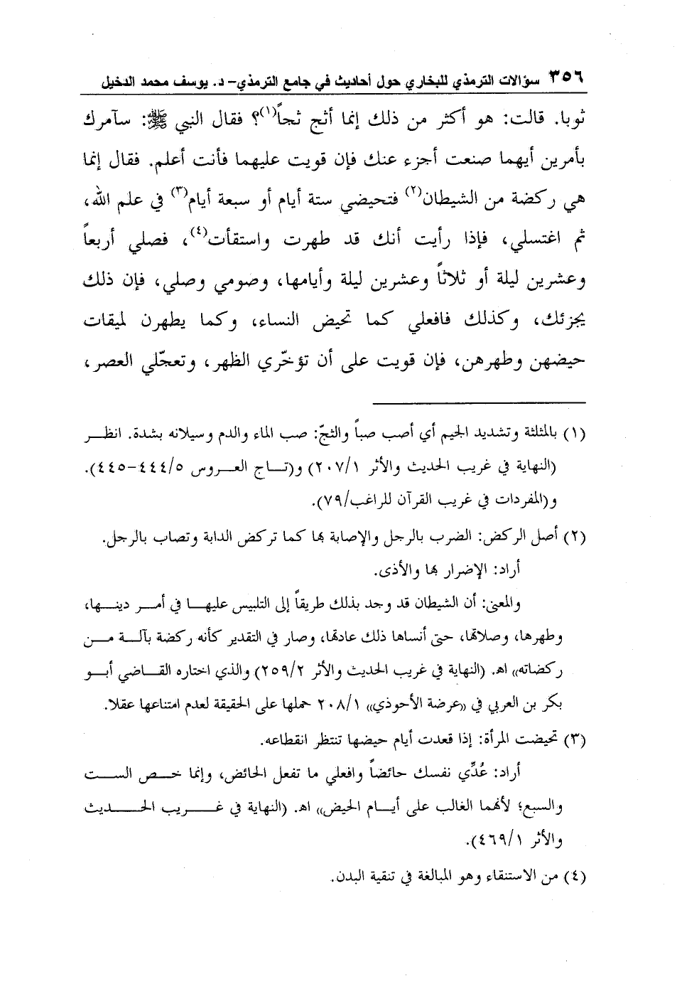 ثوبا". قالت: هو أكثر من ذلك إنما أثج ثجاً1؟ فقال النبي صلى الله عليه وسلم: "سآمرك بأمرين أيهما صنعت أجزء عنك فإن قويت عليهما فأنت أعلم. فقال إنما هي ركضة من الشيطان2 فتحيضي ستة أيام أو سبعة أيام3 في علم الله، ثم اغتسلي، فإذا رأيت أنك قد طهرت واستقأت4، فصلي أربعاً وعشرين ليلة أو ثلاثاً وعشرين ليلة وأيامها، وصومي وصلي، فإن ذلك يجزئك، وكذلك فافعلي كما تحيض النساء، وكما يطهرن لميقات حيضهن وطهرهن، فإن قويت على أن تؤخّري الظهر، وتعجّلي العصر،