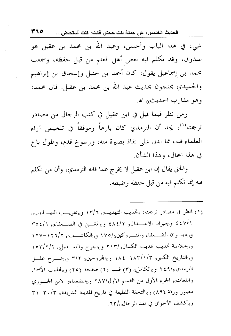 ومن نظر فيما قيل في ابن عقيل في كتب الرجال من مصادر ترجمته1، يجد أن الترمذي كان بارعاً وموفقاً في تلخيص آراء العلماء فيه، مما يدل على نفاذ بصيرة منه، ورسوخ قدم، وطول باع في هذا المجال، وهذا الشأن.