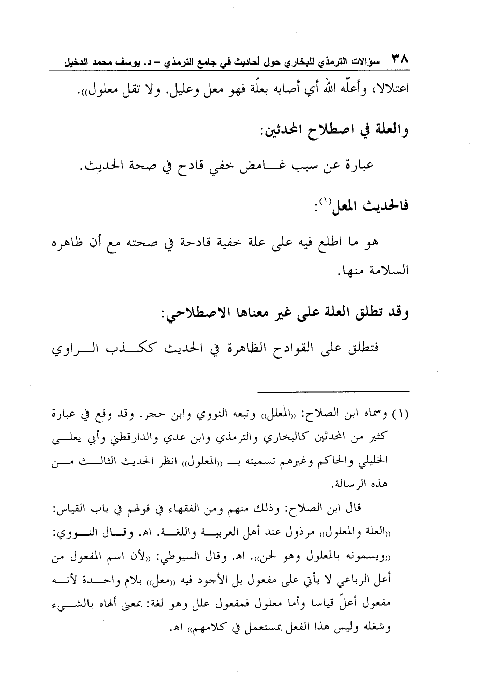 1 وسماه ابن الصلاح: "المعلل" وتبعه النووي وابن حجر. وقد وقع في عبارة كثير من المحدثين كالبخاري والترمذي وابن عدي والدارقطني وأبي يعلى الخليلي والحاكم وغيرهم تسميته بـ "المعلول" انظر الحديث الثالث من هذه الرسالة.