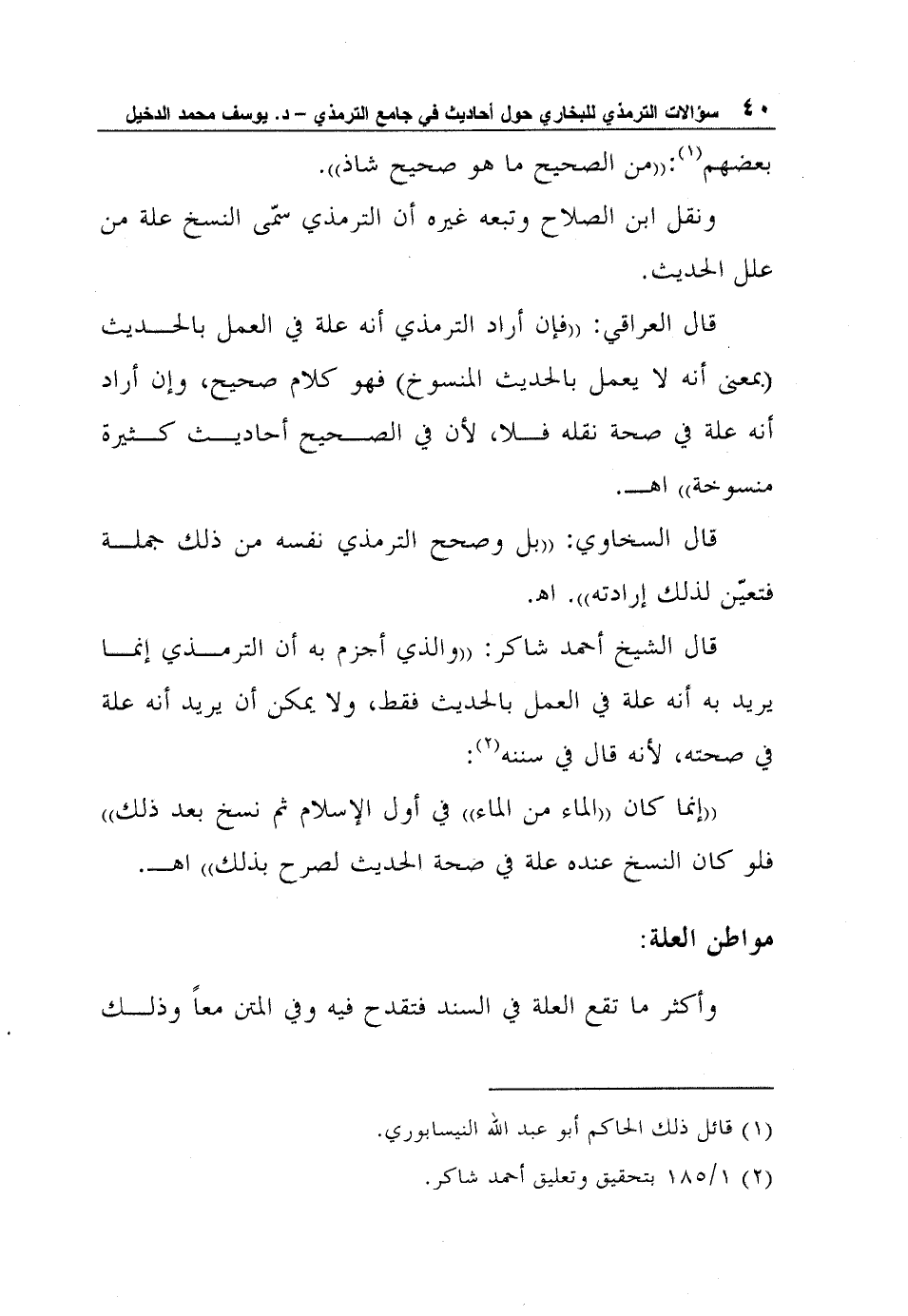 قال العراقي: "فإن أراد الترمذي أنه علة في العمل بالحديث (بمعنى أنه لا يعمل بالحديث المنسوخ) فهو كلام صحيح، وإن أراد أنه علة في صحة نقله فلا، لأن في الصحيح أحاديث كثيرة منسوخة" اه.