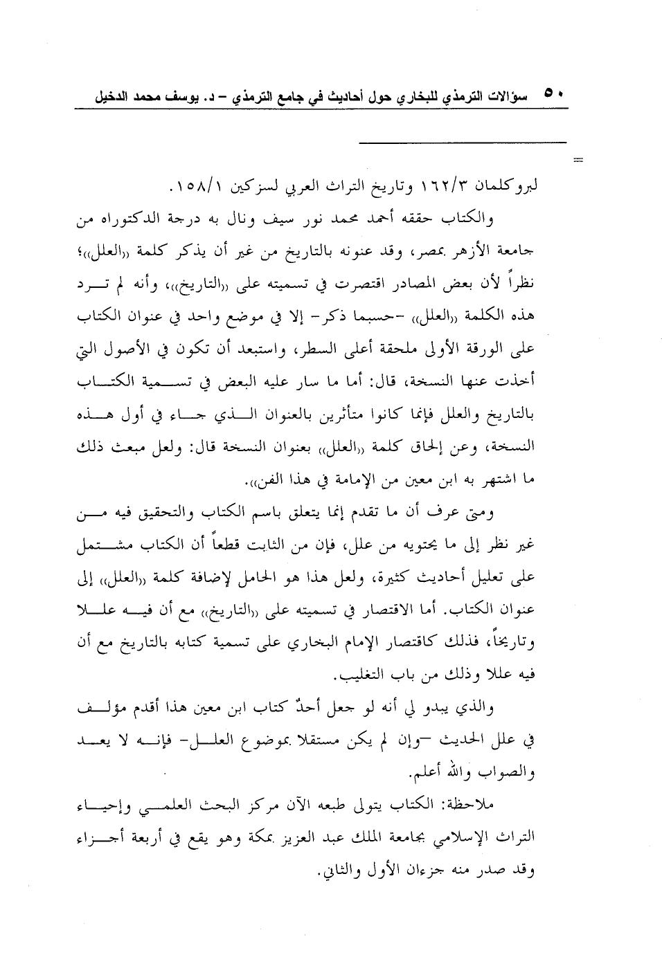 ومتى عرف أن ما تقدم إنما يتعلق باسم الكتاب والتحقيق فيه من غير نظر إلى ما يحتويه من علل، فإن من الثابت قطعاً أن الكتاب مشتمل على تعليل أحاديث كثيرة، ولعل هذا هو الحامل لإضافة كلمة "العلل" إلى عنوان الكتاب. أما الاقتصار في تسميته على "التاريخ" مع أن فيه عللا وتاريخاً، فذلك كاقتصار الإمام البخاري على تسمية كتابه بالتاريخ مع أن فيه عللا وذلك من باب التغليب.