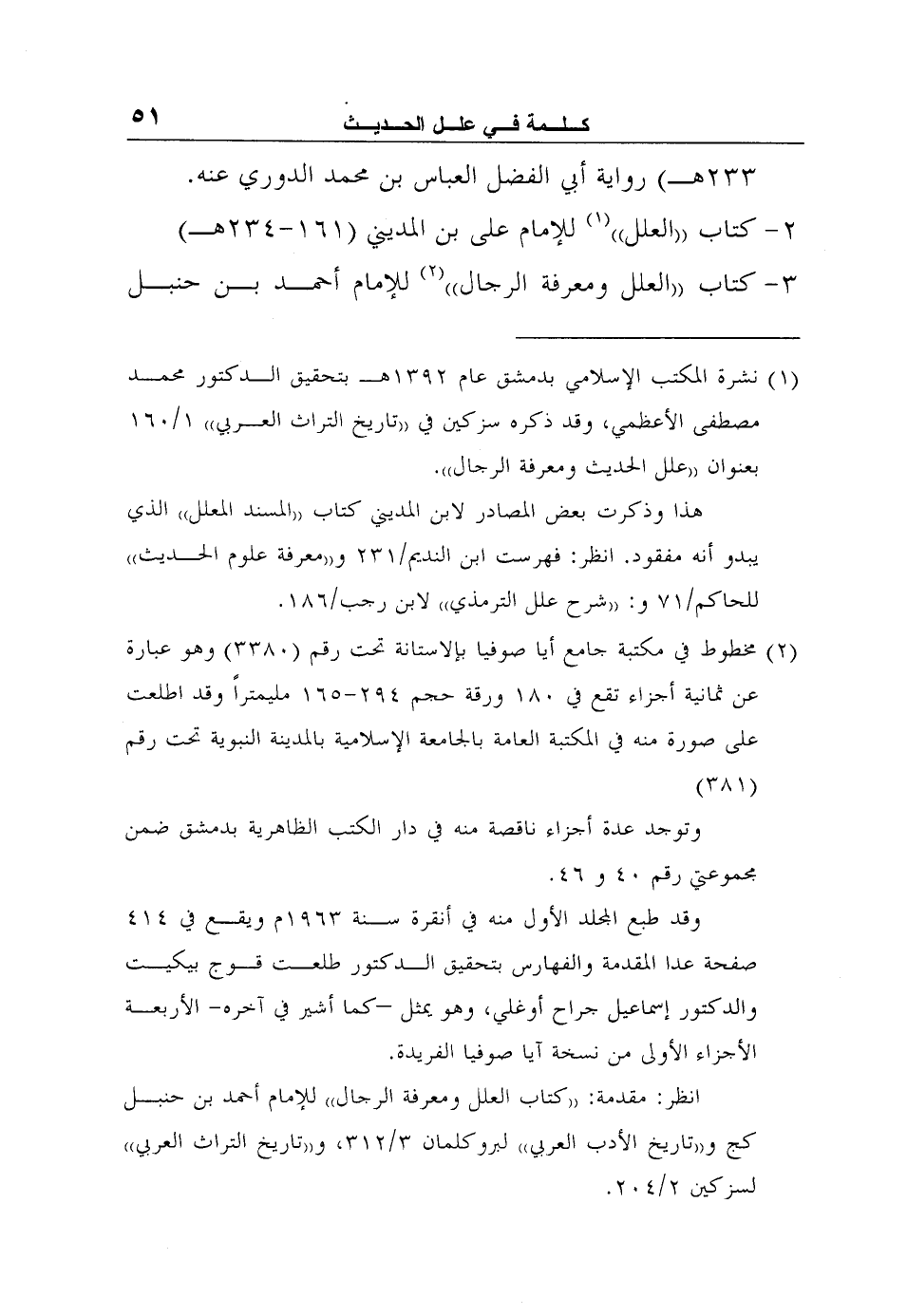 كتاب "العلل ومعرفة الرجال"2 للإمام أحمد بن حنبل