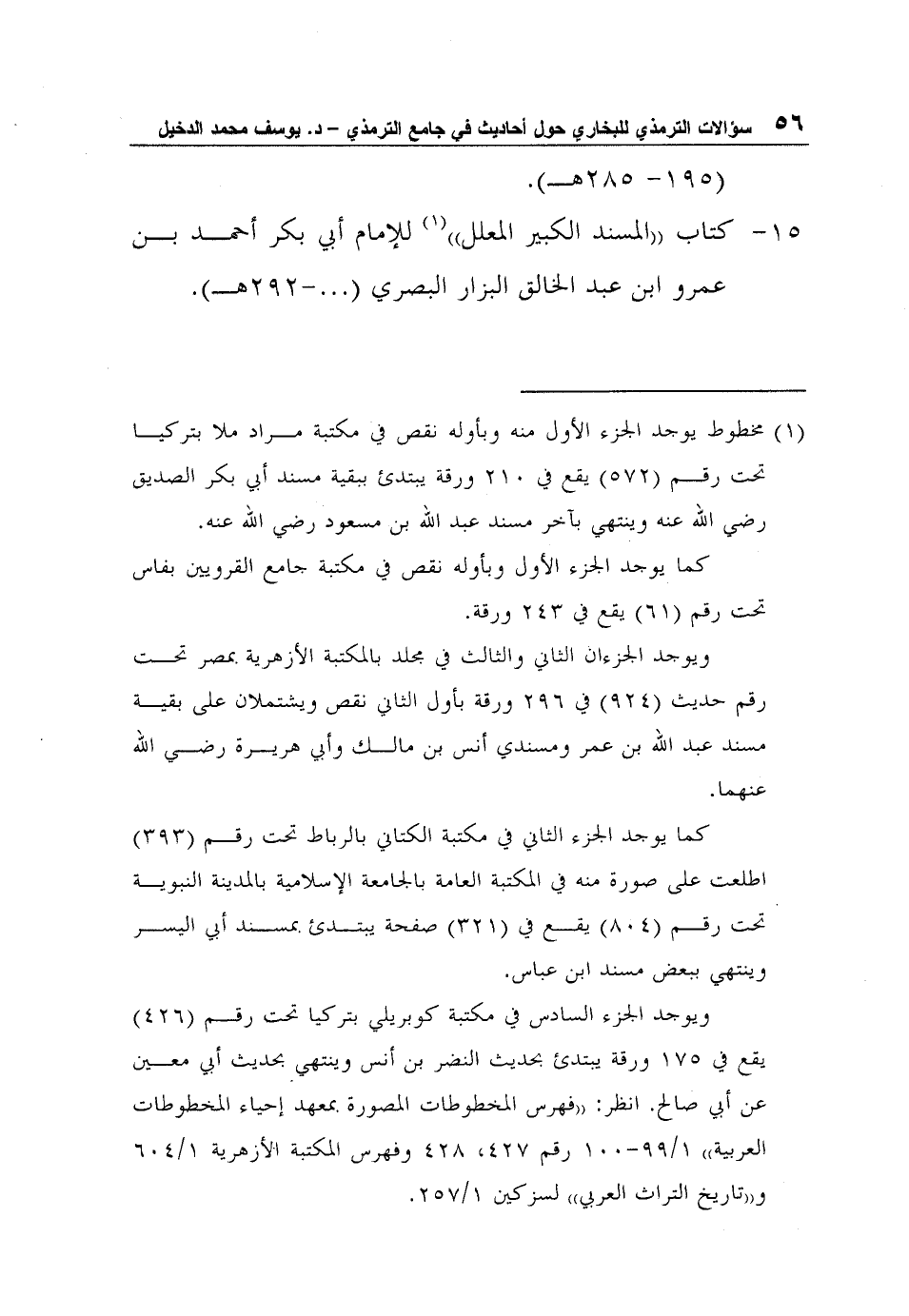 كتاب "المسند الكبير المعلل"1 للإمام أبي بكر أحمد بن عمرو ابن عبد الخالق البزار البصري ( ... -292هـ) .