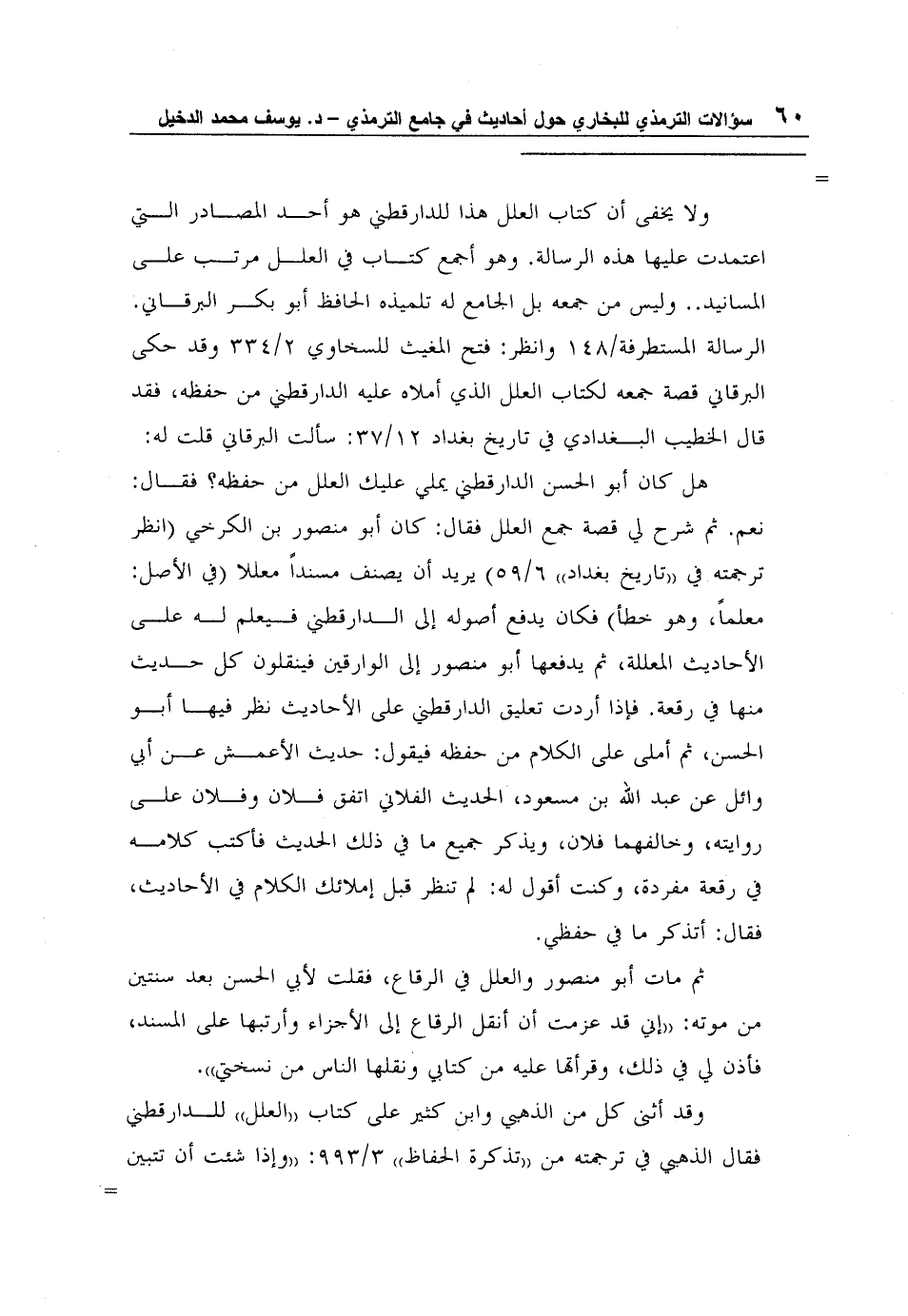 ولا يخفى أن كتاب العلل هذا للدارقطني هو أحد المصادر التي اعتمدت عليها هذه الرسالة. وهو أجمع كتاب في العلل مرتب على المسانيد.. وليس من جمعه بل الجامع له تلميذه الحافظ أبو بكر البرقاني. الرسالة المستطرفة/148 وانظر: فتح المغيث للسخاوي 2/334 وقد حكى البرقاني قصة جمعه لكتاب العلل الذي أملاه عليه الدارقطني من حفظه، فقد قال الخطيب البغدادي في تاريخ بغداد 12/37: سألت البرقاني قلت له: