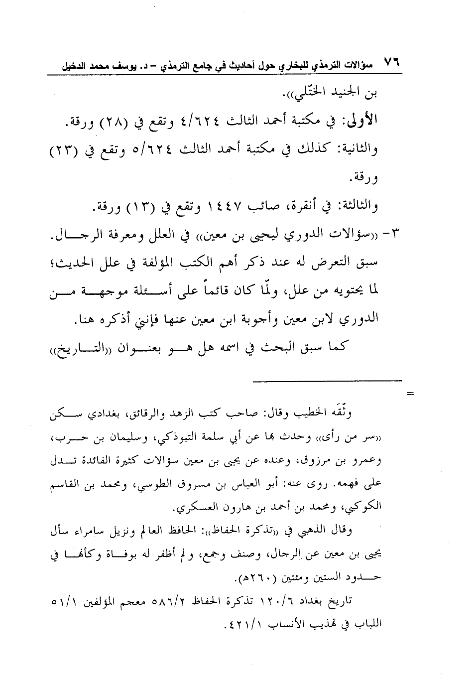 "سؤالات الدوري ليحيى بن معين" في العلل ومعرفة الرجال. سبق التعرض له عند ذكر أهم الكتب المؤلفة في علل الحديث؛ لما يحتويه من علل، ولمّا كان قائماً على أسئلة موجهة من الدوري لابن معين وأجوبة ابن معين عنها فإنني أذكره هنا.