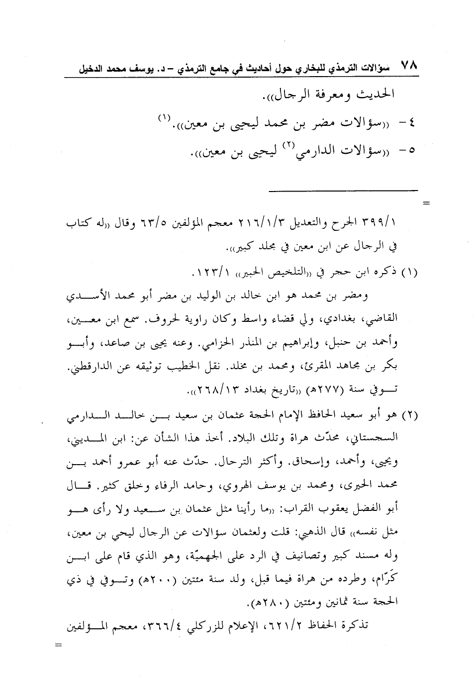 "سؤالات مضر بن محمد ليحيى بن معين".1