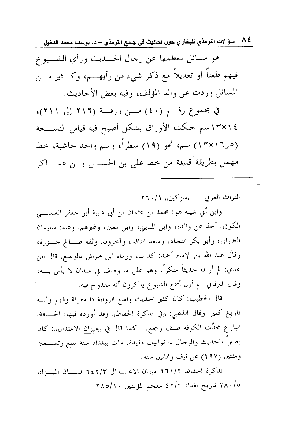 هو مسائل معظمها عن رجال الحديث ورأي الشيوخ فيهم طعناً أو تعديلاً مع ذكر شيء من رأيهم، وكثير من المسائل وردت عن والد المؤلف، وفيه بعض الأحاديث.