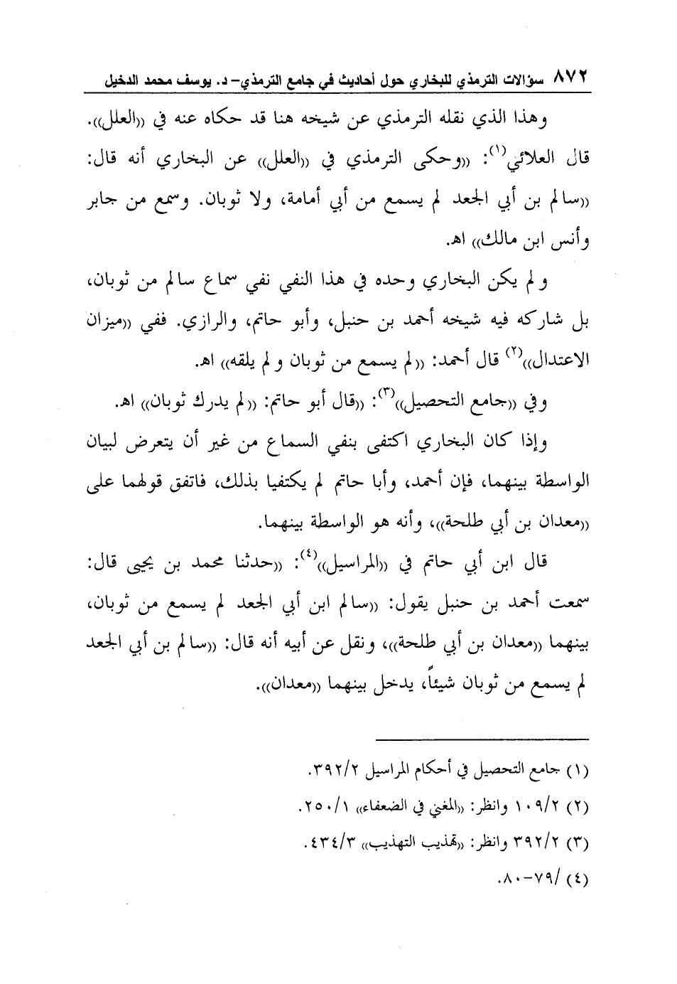 ولم يكن البخاري وحده في هذا النفي نفي سماع سالم من ثوبان، بل شاركه فيه شيخه أحمد بن حنبل، وأبو حاتم، والرازي. ففي "ميزان الاعتدال"2 قال أحمد: "لم يسمع من ثوبان ولم يلقه" ا?.