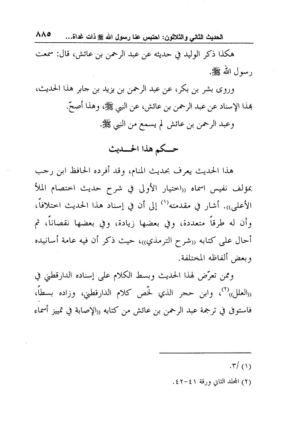 وممن تعرّض لهذا الحديث وبسط الكلام على إسناده الدارقطني في "العلل"2، وابن حجر الذي لخّص كلام الدارقطني، وزاده بسطاً، فاستوفى في ترجمة عبد الرحمن بن عائش من كتابه "الإصابة في تمييز أسماء