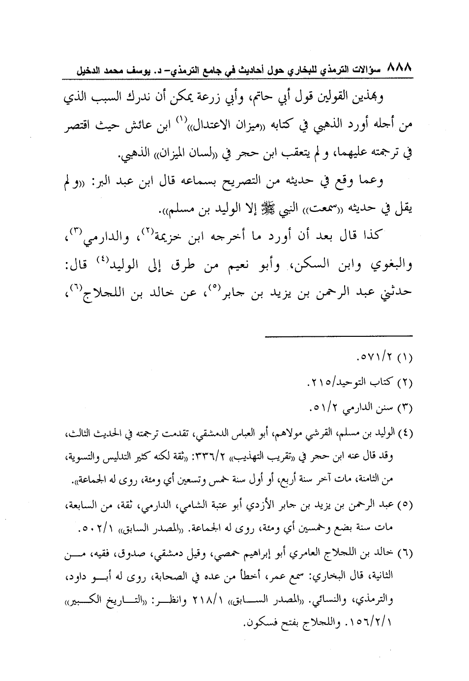 4 الوليد بن مسلم، القرشي مولاهم، أبو العباس الدمشقي، تقدمت ترجمته في الحديث الثالث، وقد قال عنه ابن حجر في "تقريب التهذيب" 2/336: "ثقة لكنه كثير التدليس والتسوية، من الثامنة، مات آخر سنة أربع، أو أول سنة خمس وتسعين أي ومئة، روى له الجماعة".