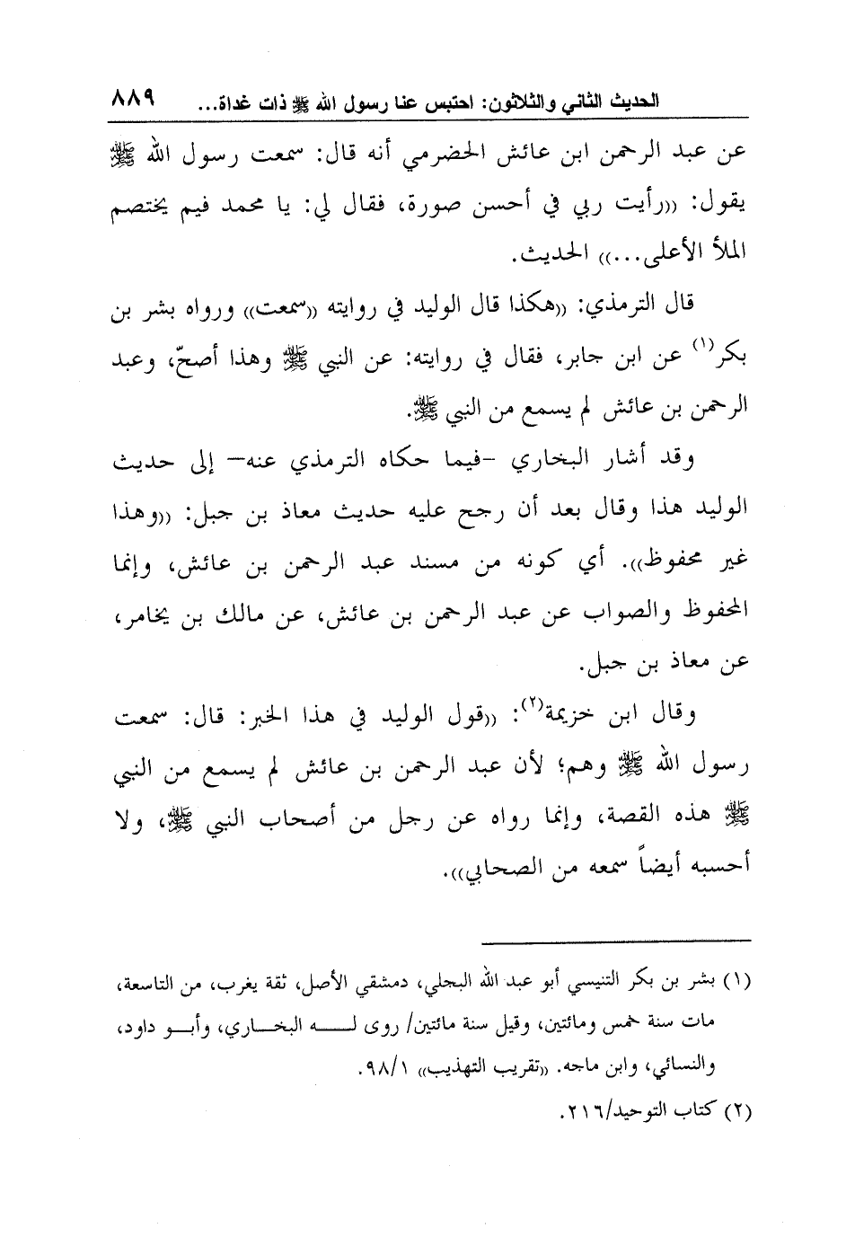 عن عبد الرحمن ابن عائش الحضرمي أنه قال: سمعت رسول الله صلى الله عليه وسلم يقول: "رأيت ربي في أحسن صورة، فقال لي: يا محمد فيم يختصم الملأ الأعلى ... " الحديث.