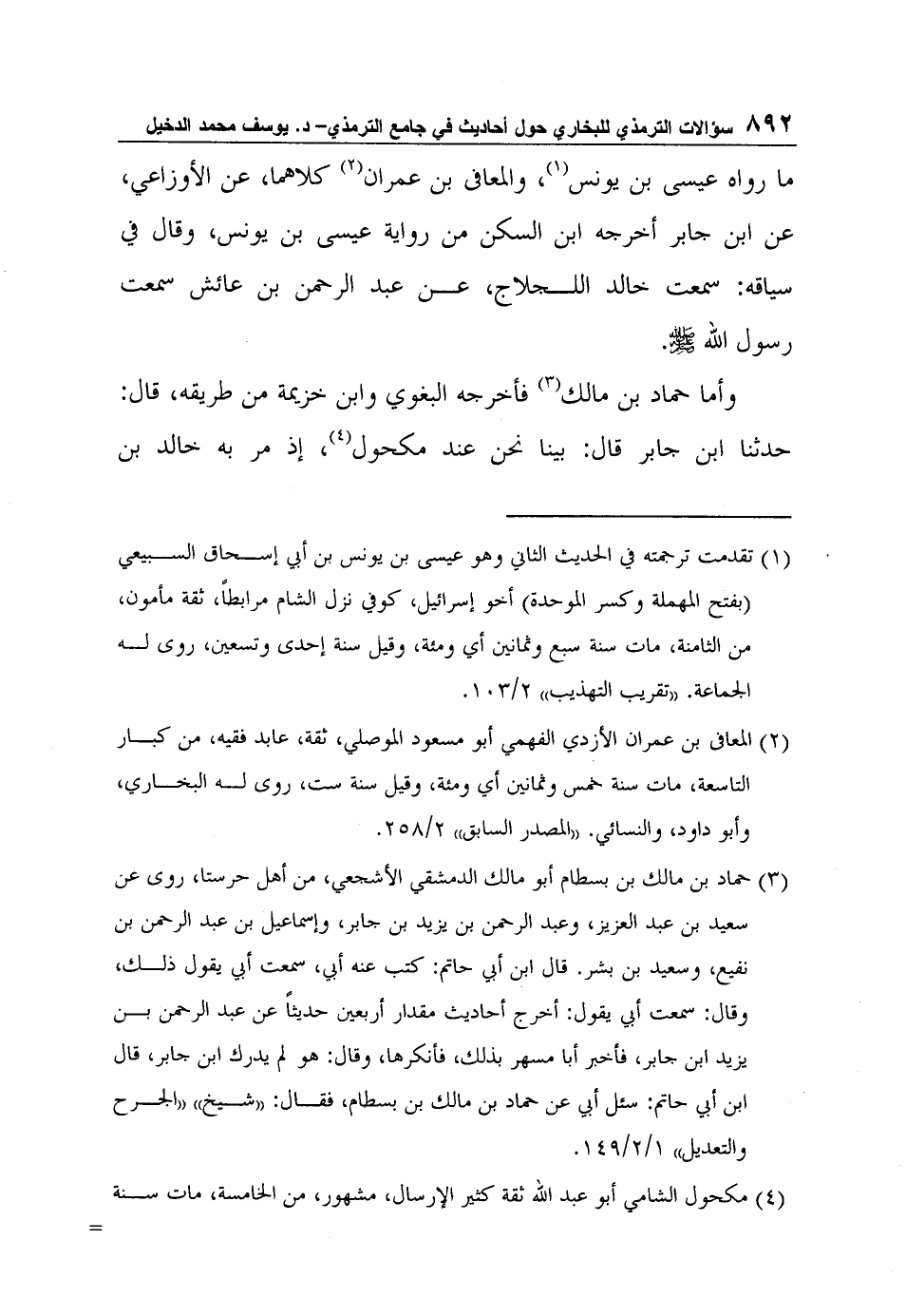 وأما حماد بن مالك3 فأخرجه البغوي وابن خزيمة من طريقه، قال: حدثنا ابن جابر قال: بينا نحن عند مكحول4، إذ مر به خالد بن