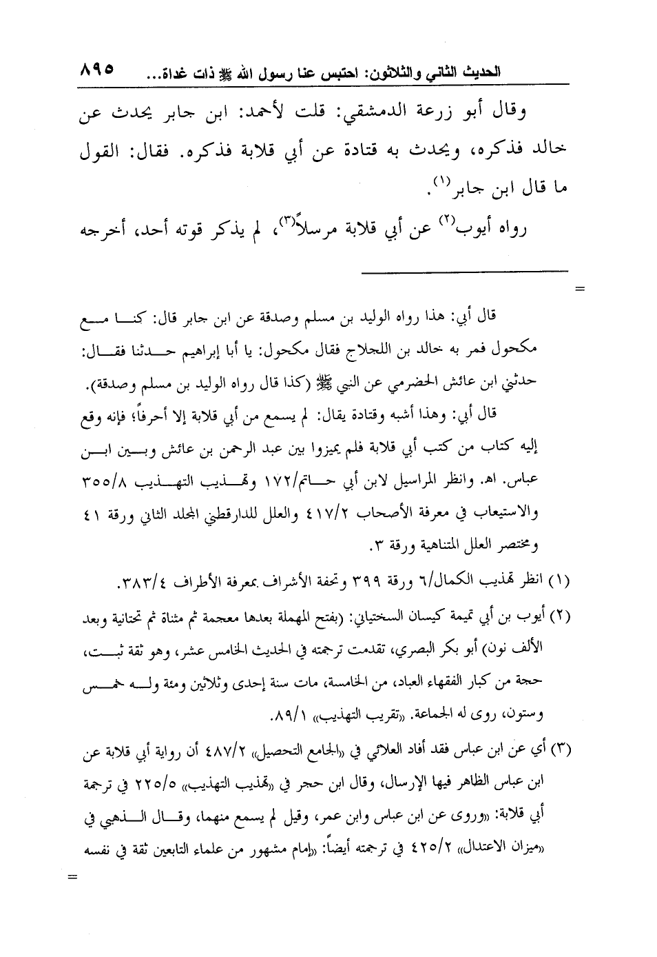 3 أي عن ابن عباس فقد أفاد العلائي في "الجامع التحصيل" 2/487 أن رواية أبي قلابة عن ابن عباس الظاهر فيها الإرسال، وقال ابن حجر في "تهذيب التهذيب" 5/225 في ترجمة أبي قلابة: "وروى عن ابن عباس وابن عمر، وقيل لم يسمع منهما، وقال الذهبي في "ميزان الاعتدال" 2/425 في ترجمته أيضاً: "إمام مشهور من علماء التابعين ثقة في نفسه إلا أنه يدلس عمن لحقهم، وعمن لم يلحقهم، وكان له صحف يحدث منها، ويدلس" ذكره ابن حجر في الطبقة الأولى من "طبقات المدلسين" وهي من لم يوصف بالتدليس إلا نادراً، فقال/4: "عبد الله بن زيد الجرمي أبو قلابة التابعي الشهير مشهور بكنيته، وصفه بذلك الذهبي والعلائي" ولعل هذا هو الذي جعل أحمد شاكر ينفي عنه التدليس، فقال في تعليقه على مسند الإمام أحمد بن حنبل 12/134 عنه الحديث رقم (7148) : "وأبو قلابة لم يعرف بتدليس".