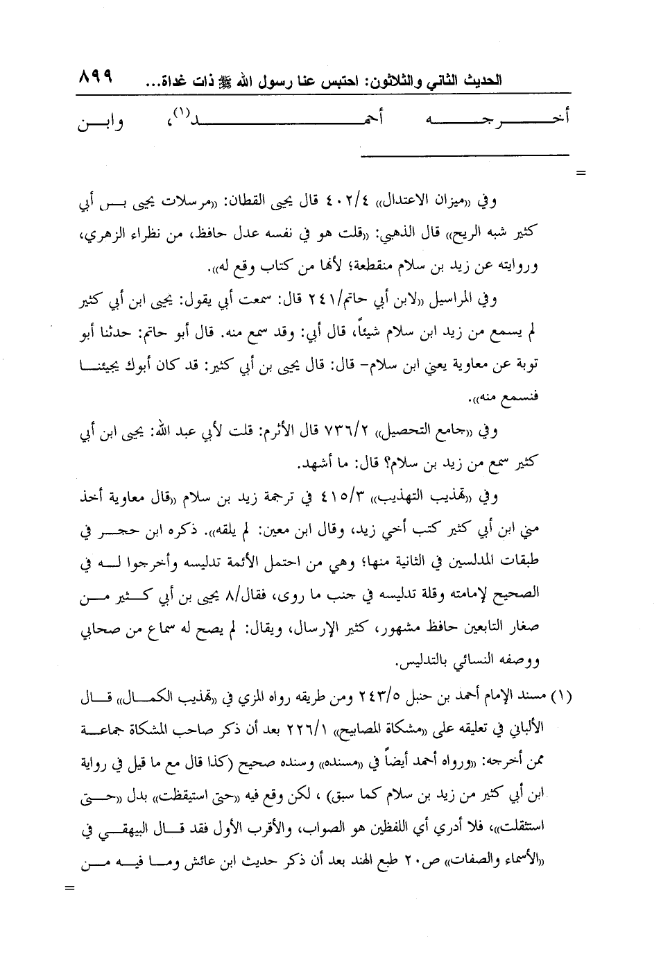1 مسند الإمام أحمد بن حنبل 5/243 ومن طريقه رواه المزي في "تهذيب الكمال" قال الألباني في تعليقه على "مشكاة المصابيح" 1/226 بعد أن ذكر صاحب المشكاة جماعة ممن أخرجه: "ورواه أحمد أيضاً في "مسنده" وسنده صحيح (كذا قال مع ما قيل في رواية ابن أبي كثير من زيد بن سلام كما سبق) ، لكن وقع فيه "حتى استيقظت" بدل "حتى استثقلت"، فلا أدري أي اللفظين هو الصواب، والأقرب الأول فقد قال البيهقي في "الأسماء والصفات" ص20 طبع الهند بعد أن ذكر حديث ابن عائش وما فيه من الاختلاف "وقد روي من أوجه آخر كلها ضعيف، وأحسن طريق فيه رواية جهضم بن عبد الله –يعني حديث معاذ هذا- ثم رواية موسى بن خلف"، وفيها ما دل على أن ذلك كان في النوم.