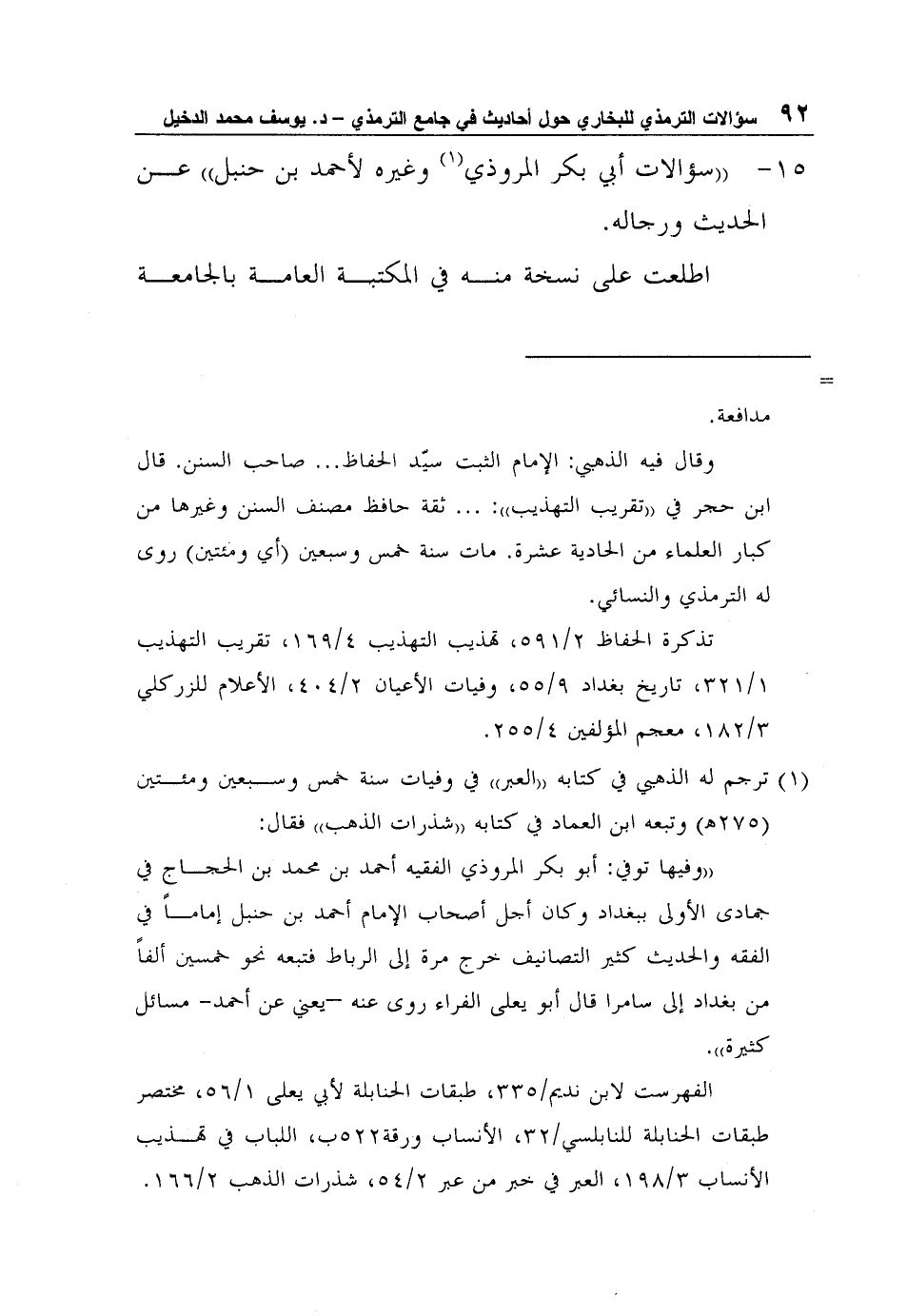 "سؤالات أبي بكر المروذي1 وغيره لأحمد بن حنبل" عن الحديث ورجاله.
