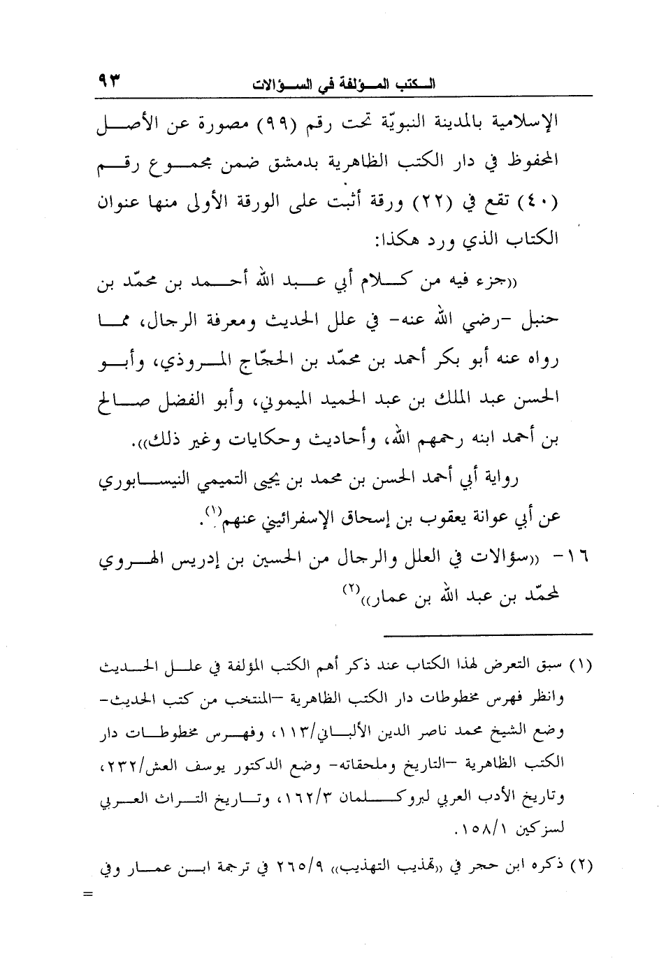 1 سبق التعرض لهذا الكتاب عند ذكر أهم الكتب المؤلفة في علل الحديث وانظر فهرس مخطوطات دار الكتب الظاهرية –المنتخب من كتب الحديث- وضع الشيخ محمد ناصر الدين الألباني/113، وفهرس مخطوطات دار الكتب الظاهرية –التاريخ وملحقاته- وضع الدكتور يوسف العش/232، وتاريخ الأدب العربي لبروكلمان 3/162، وتاريخ التراث العربي لسزكين 1/158.
