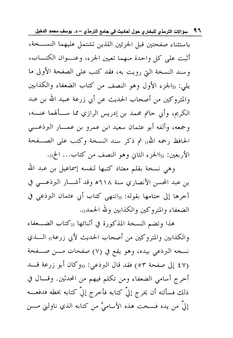 وهي نسخة بقلم معتاد كتبها لنفسه إسماعيل بن عبد الله بن عبد المحسن الأنصاري سنة 618? وقد أشار البرذعي في آخرها إلى ختامها بقوله: "انتهى كتاب أبي عثمان البرذعي في الضعفاء والمتروكين والكذابين ولله الحمد".