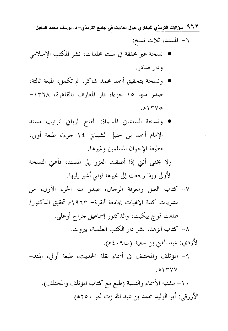 ونسخة الساعاتي المسماة: الفتح الرباني لترتيب مسند الإمام أحمد بن حنبل الشيباني 24 جزءا، طبعة أولى، مطبعة الإخوان المسلمين وغيرها.