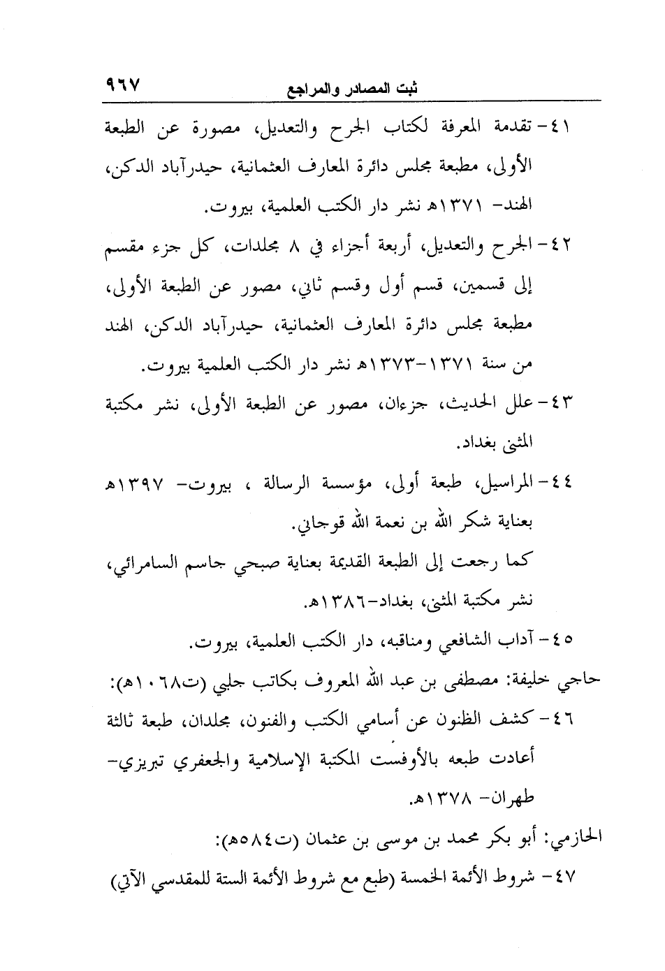 تقدمة المعرفة لكتاب الجرح والتعديل، مصورة عن الطبعة الأولى، مطبعة مجلس دائرة المعارف العثمانية، حيدرآباد الدكن، الهند- 1371? نشر دار الكتب العلمية، بيروت.