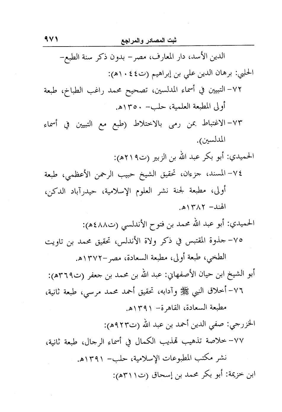 خلاصة تذهيب تهذيب الكمال في أسماء الرجال، طبعة ثانية، نشر مكتب المطبوعات الإسلامية، حلب- 1391?.