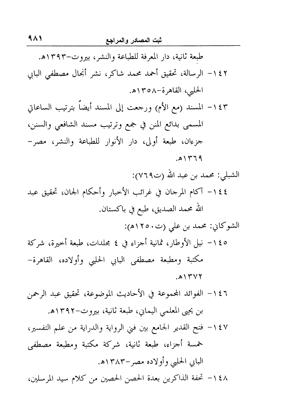 نيل الأوطار، ثمانية أجزاء في 4 مجلدات، طبعة أخيرة، شركة مكتبة ومطبعة مصطفى البابي الحلبي وأولاده، القاهرة-1372?.