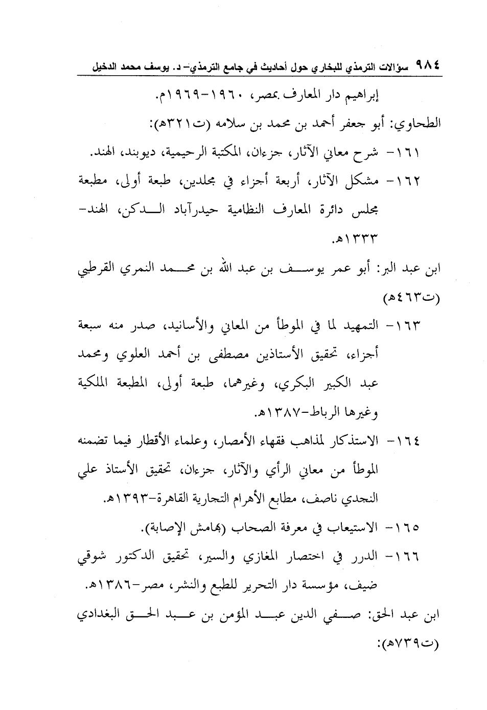 الاستذكار لمذاهب فقهاء الأمصار، وعلماء الأقطار فيما تضمنه الموطأ من معاني الرأي والآثار، جزءان، تحقيق الأستاذ علي النجدي ناصف، مطابع الأهرام التجارية القاهرة-1393?.