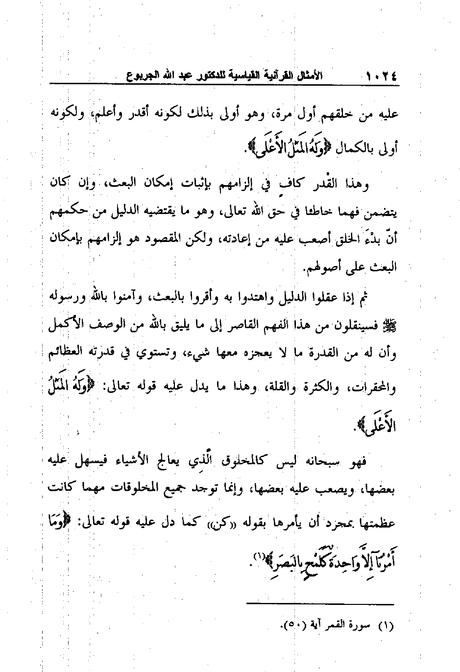 ثم إذا عقلوا الدليل واهتدوا به وأقروا بالبعث، وآمنوا بالله ورسوله صلى الله عليه وسلم فسينقلون من هذا الفهم القاصر إلى ما يليق بالله من الوصف الأكمل وأن له من القدرة ما لا يعجزه معها شيء، وتستوي في قدرته العظائم والمحقرات، والكثرة والقلة، وهذا ما يدل عليه قوله تعالى: {وَلَهُ المَثَلُ الأَعْلَى} .