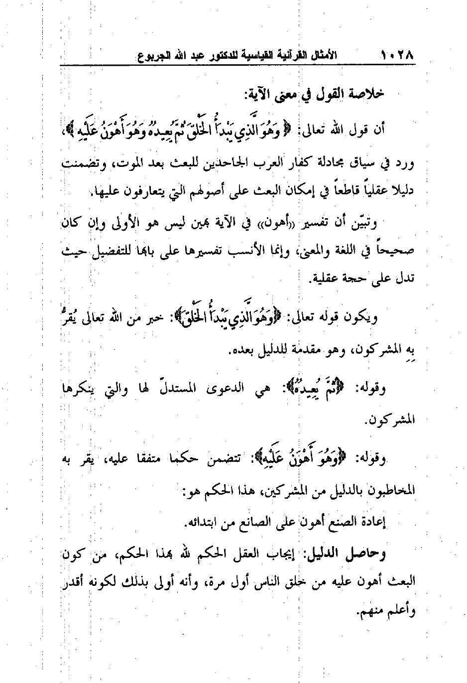 وتبيّن أن تفسير "أهون" في الآية بهين ليس هو الأولى وإن كان صحيحاً في اللغة والمعنى، وإنما الأنسب تفسيرها على بابها للتفضيل حيث تدل على حجة عقلية.