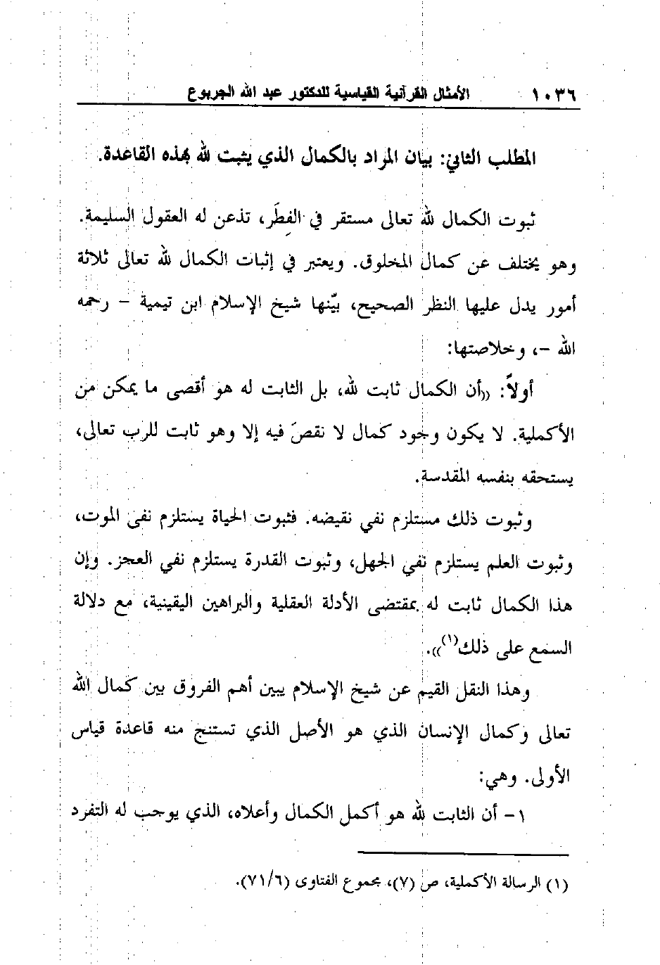 وهذا النقل القيم عن شيخ الإسلام يبين أهم الفروق بين كمال الله تعالى وكمال الإنسان الذي هو الأصل الذي تستنج منه قاعدة قياس الأولى. وهي: