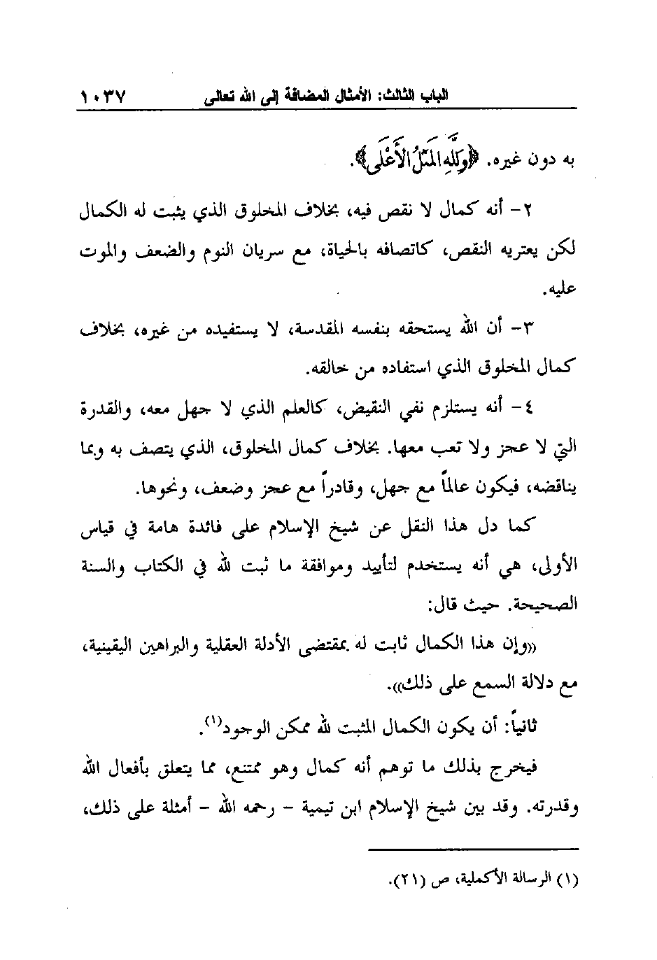 4- أنه يستلزم نفي النقيض، كالعلم الذي لا جهل معه، والقدرة التي لا عجز ولا تعب معها. بخلاف كمال المخلوق، الذي يتصف به وبما يناقضه، فيكون عالماً مع جهل، وقادراً مع عجز وضعف، ونحوها.