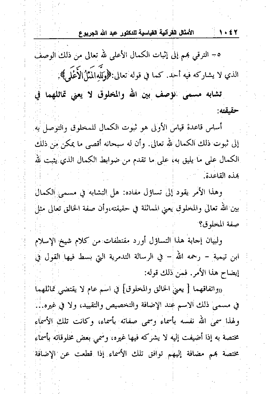 وهذا الأمر يقود إلى تساؤل مفاده: هل التشابه في مسمى الكمال بين الله تعالى والمخلوق يعني المماثلة في حقيقته، وأن صفة الخالق تعالى مثل صفة المخلوق؟
