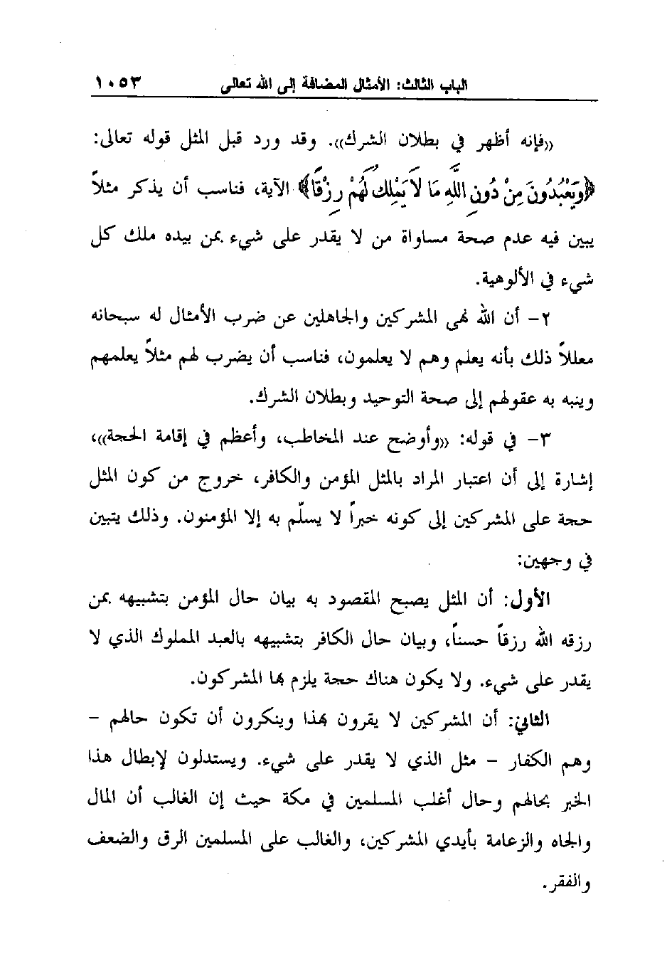 الأول: أن المثل يصبح المقصود به بيان حال المؤمن بتشبيهه بمن رزقه الله رزقاً حسناً، وبيان حال الكافر بتشبيهه بالعبد المملوك الذي لا يقدر على شيء. ولا يكون هناك حجة يلزم بها المشركون.
