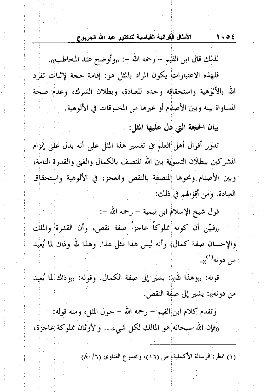قول شيخ الإسلام ابن تيمية - رحمه الله -: "فبيّن أن كونه مملوكاً عاجزاً صفة نقص، وأن القدرة والملك والإحسان صفة كمال، وأنه ليس هذا مثل هذا. وهذا لله وذاك لما يُعبد من دونه1".